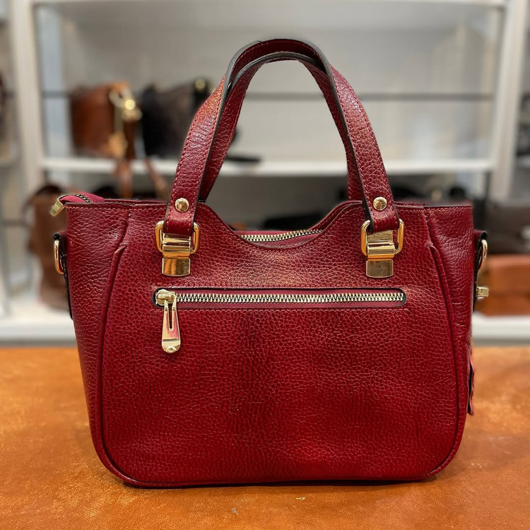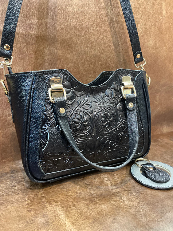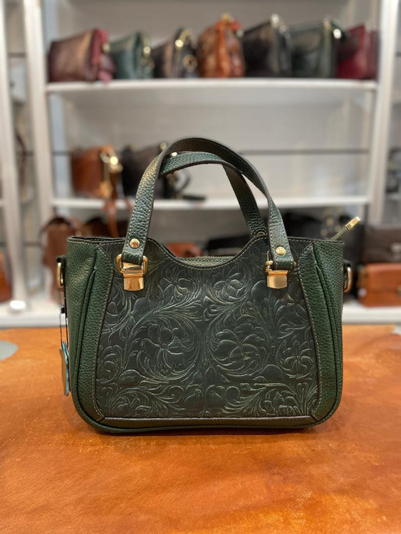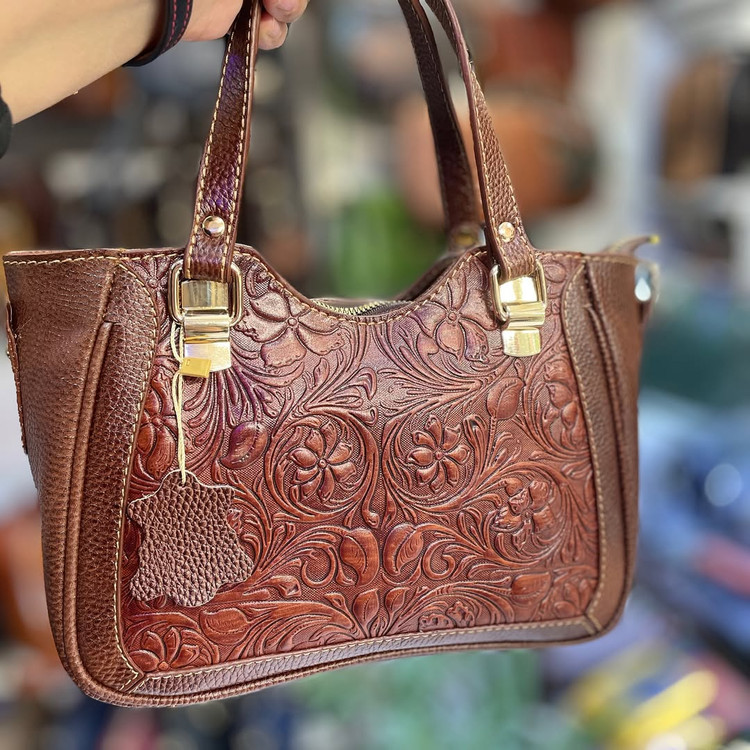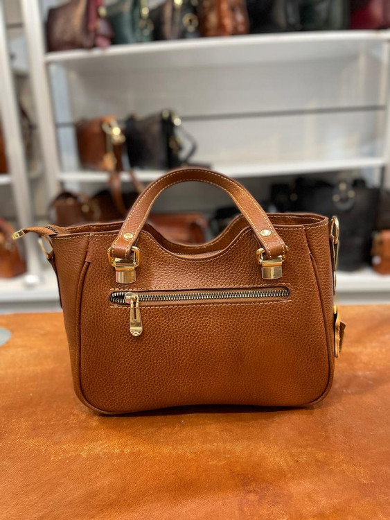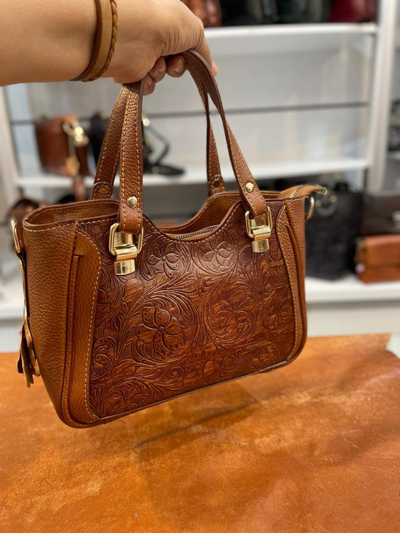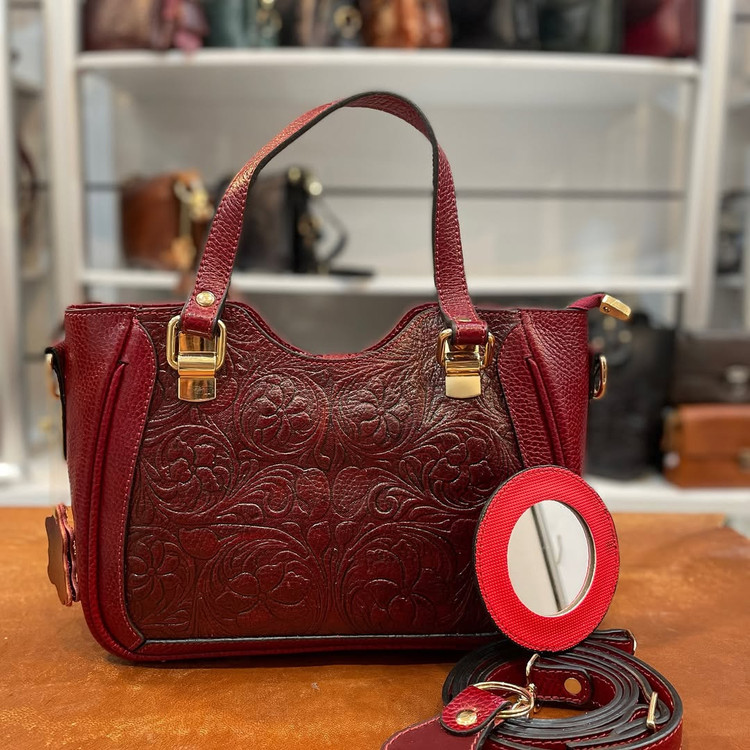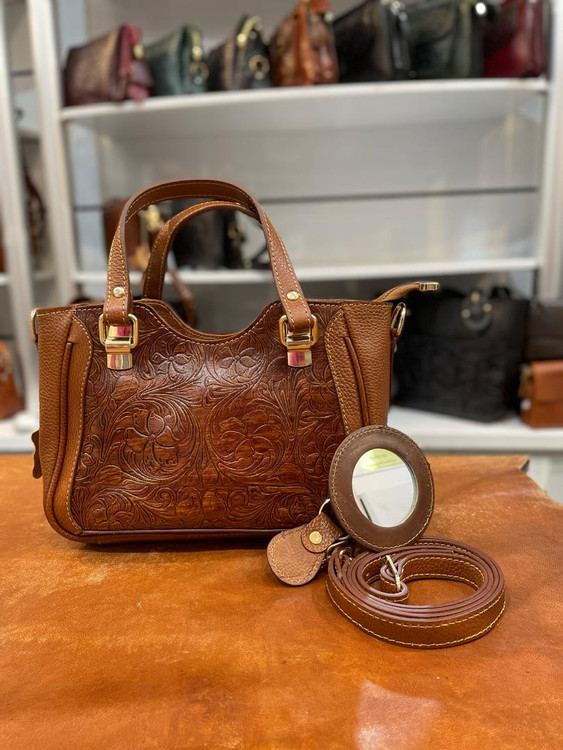 كيف دستي قابدار چرمي حكاكي شده و دسترنگ تمام چرم گاوي داراي بند بلند دوشي و آيينه و سركليدي ست با ضمانت يكساله.