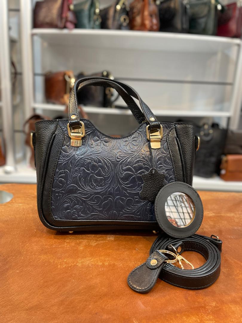 كيف دستي قابدار چرمي حكاكي شده و دسترنگ تمام چرم گاوي داراي بند بلند دوشي و آيينه و سركليدي ست با ضمانت يكساله.