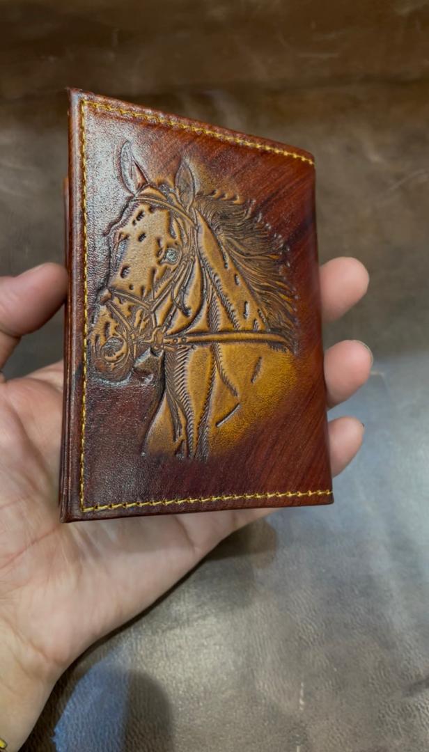 ست کیف کارت و پول با حکاکی طرح اسب، تمام چرم طبیعی ، حکاکی شده و دسترنگ، چرم طبیعی گاوی دسترنگ