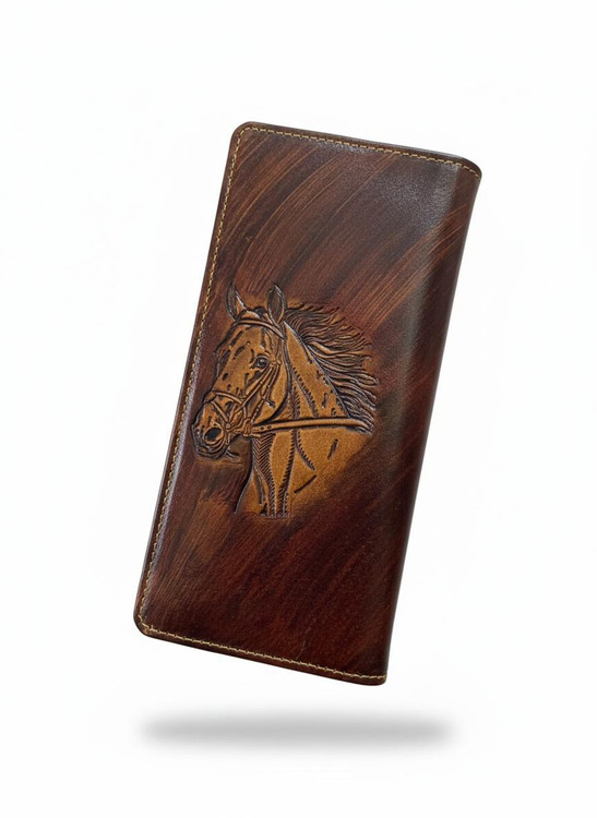 كيف پول كتي تمام چرم طبيعي، حكاكي شده و دسترنگ با حكاكي طرح اسب ، چرم گاباي ، سفارشات عمده پذيرفته ميشود