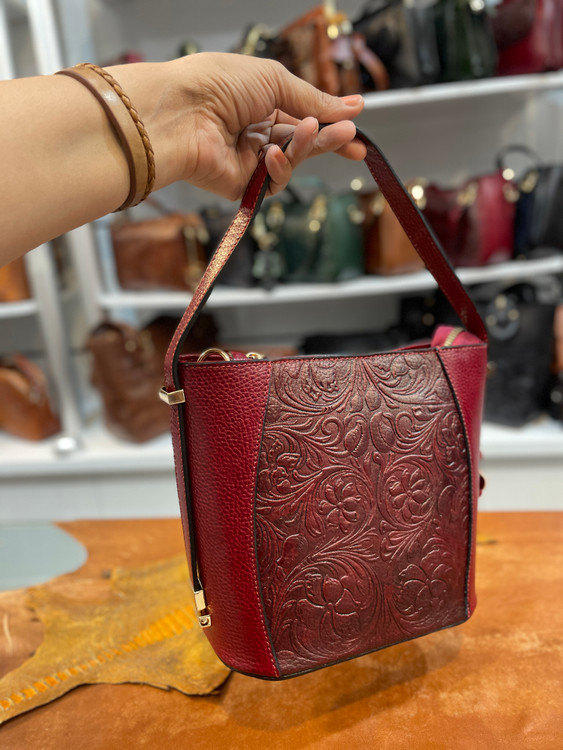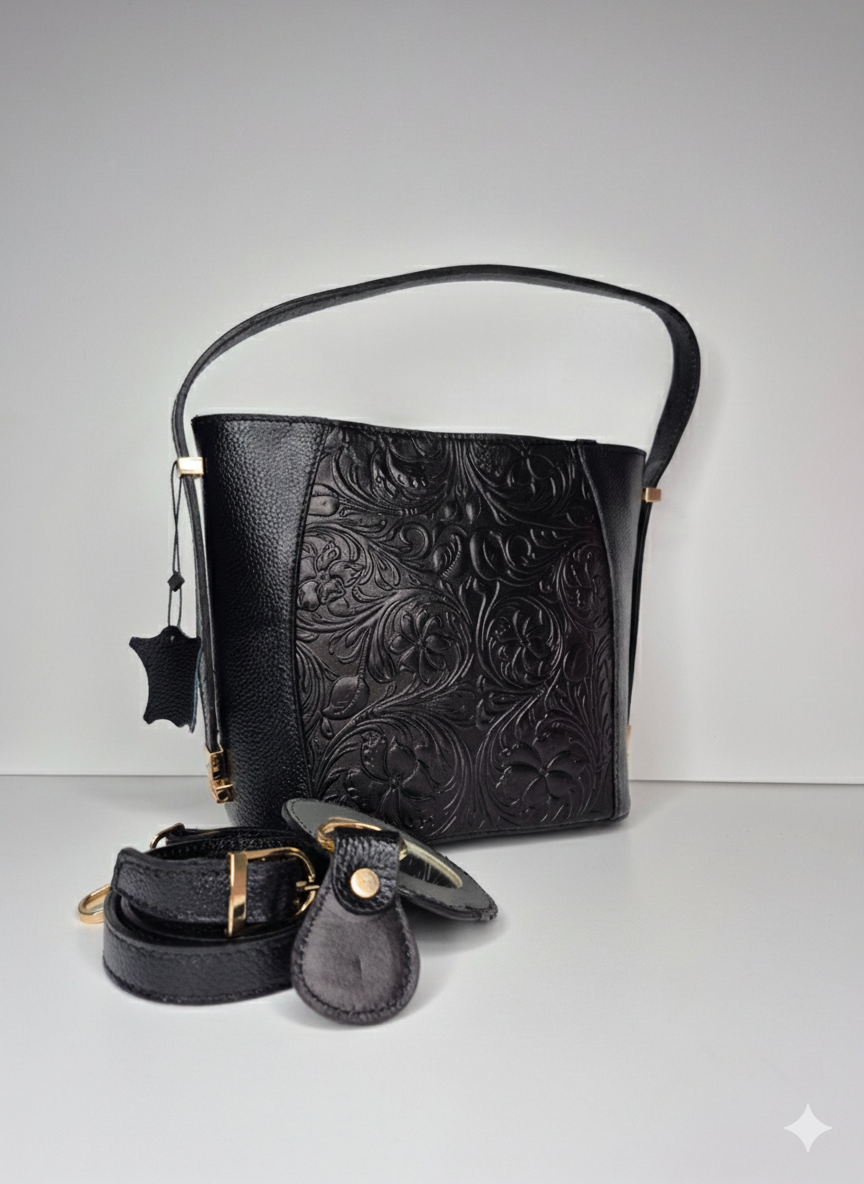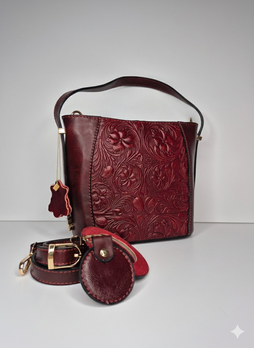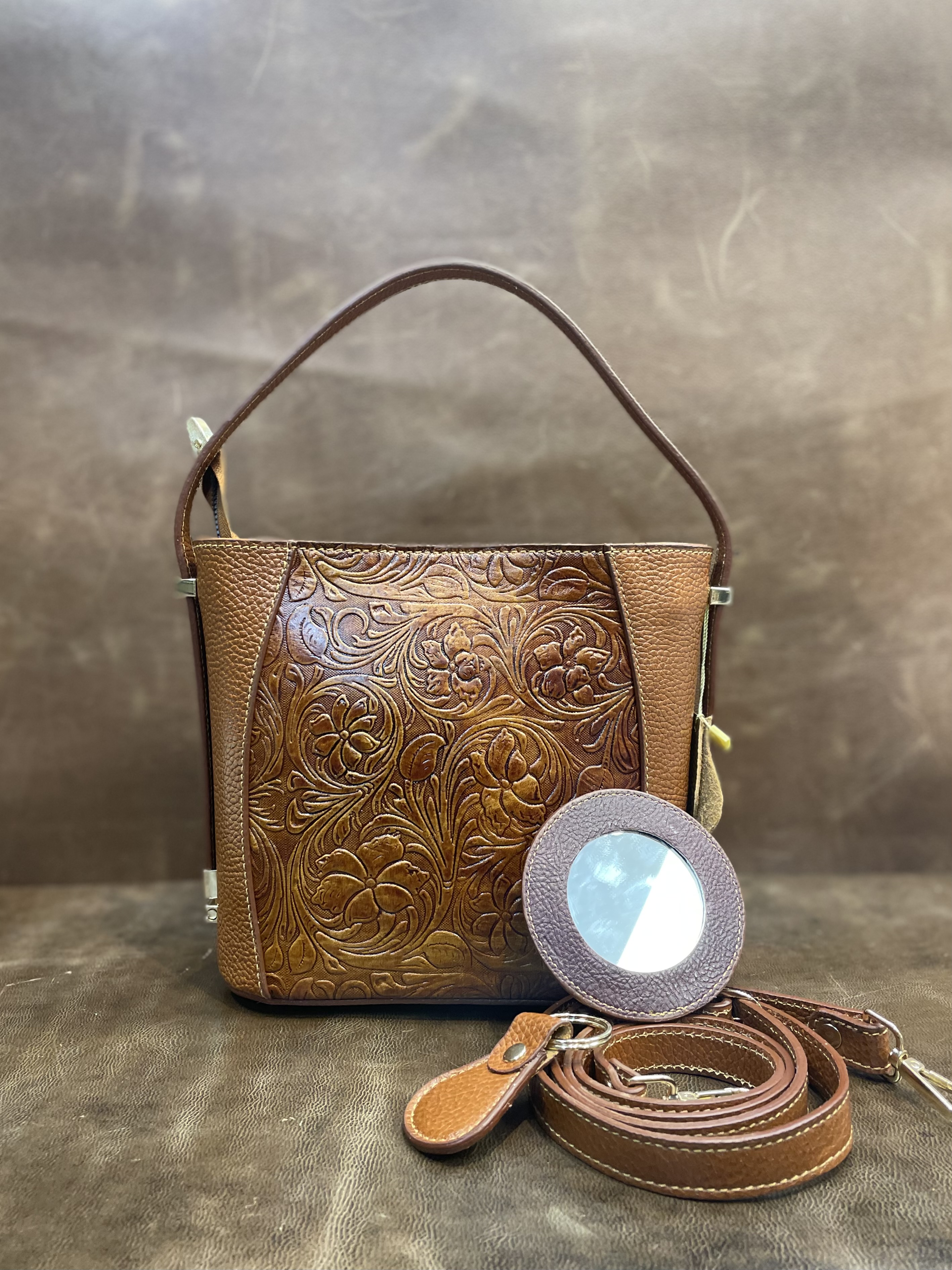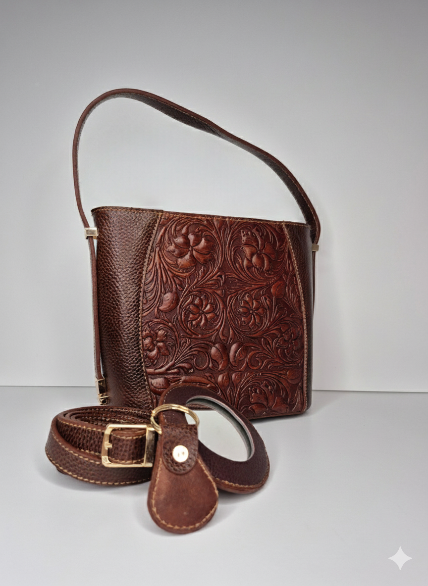 كيف دستي و دوشي زنانه ، حكاكي شده، تمام چرم طبيعي ، قابليت كوتاه و بلند شدن دسته كيف و داراي بند بلند دوشيو آيينه و سركليدي ست