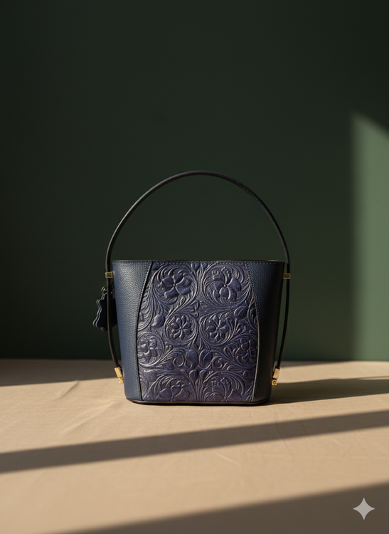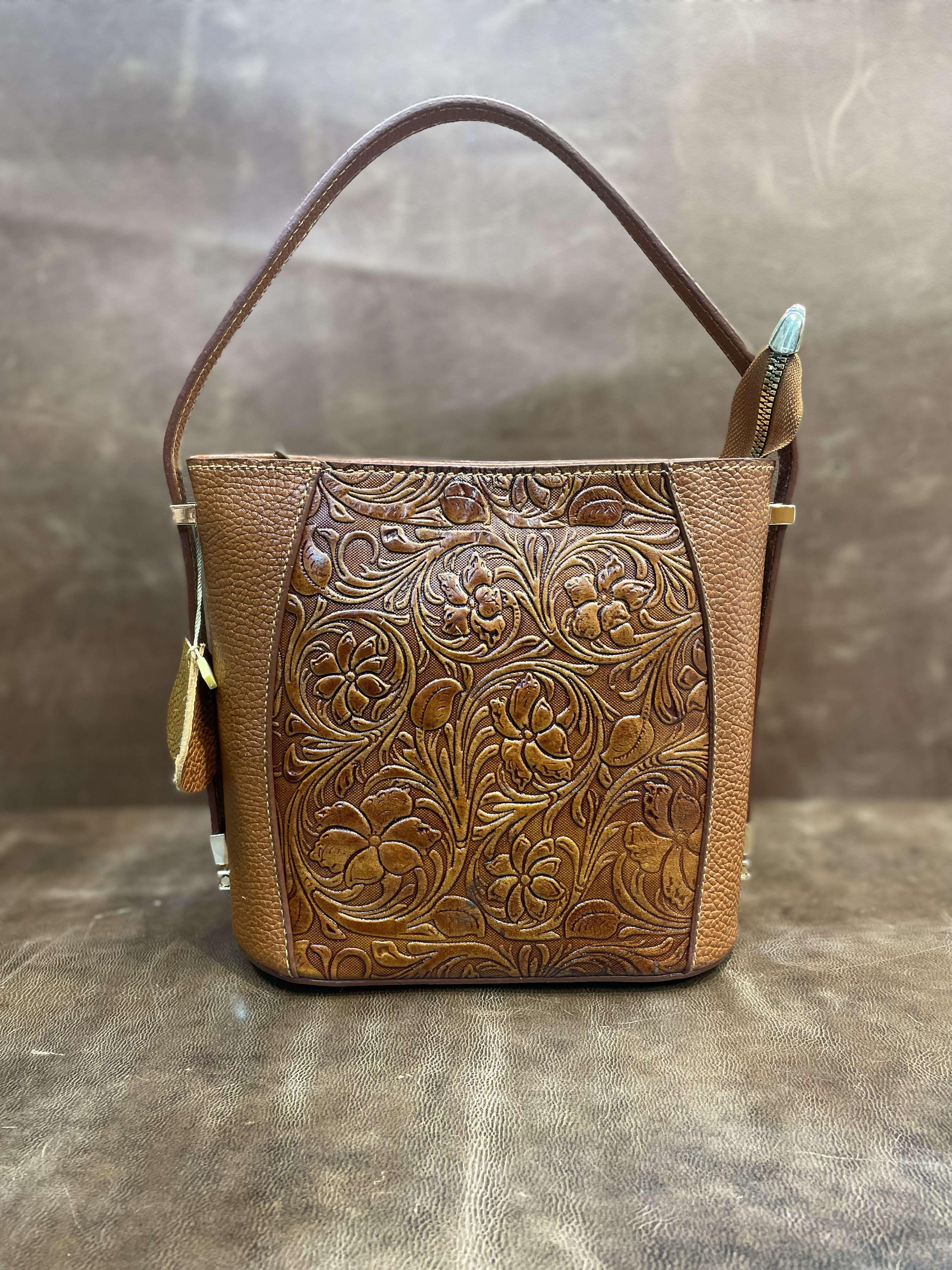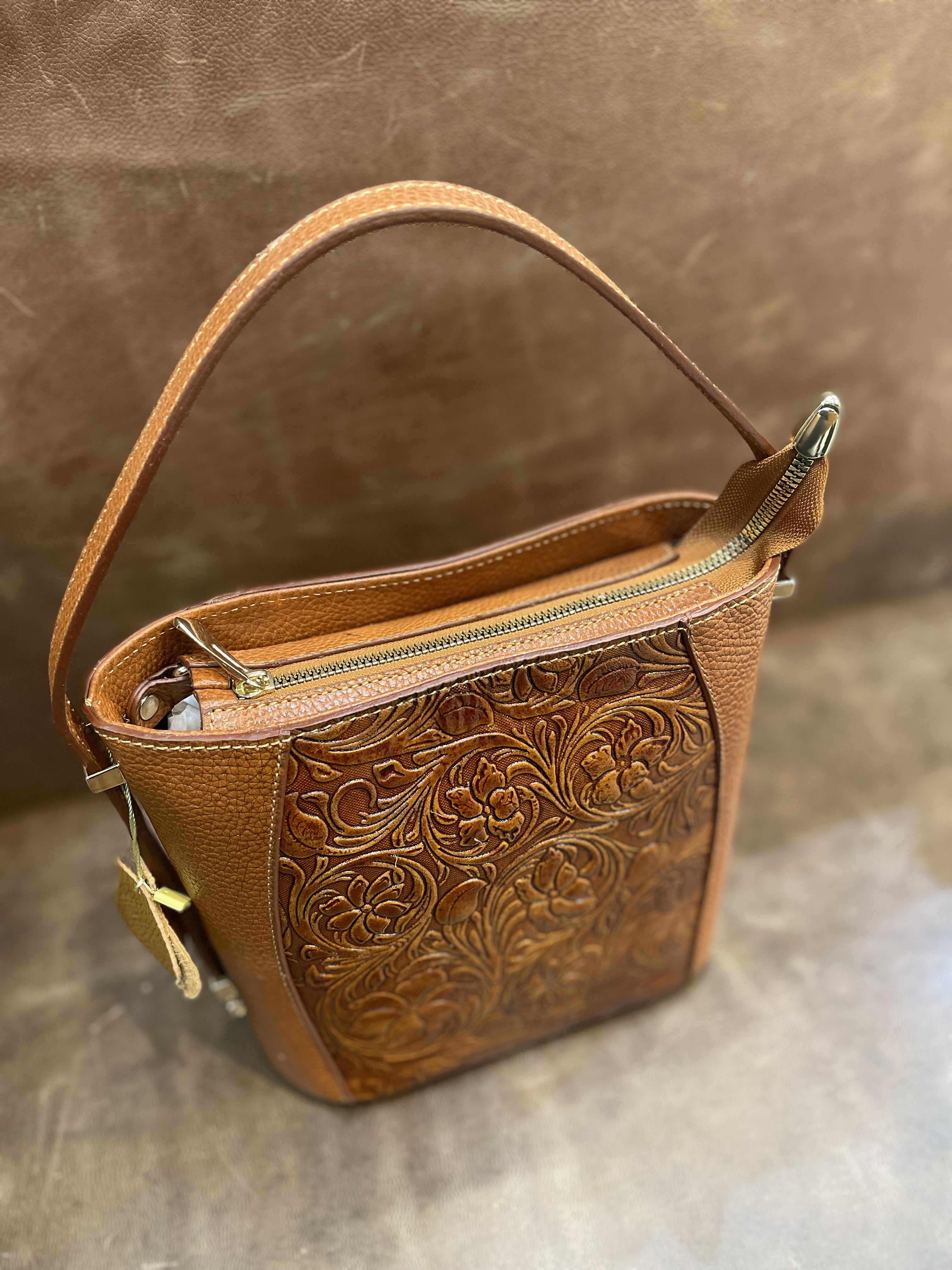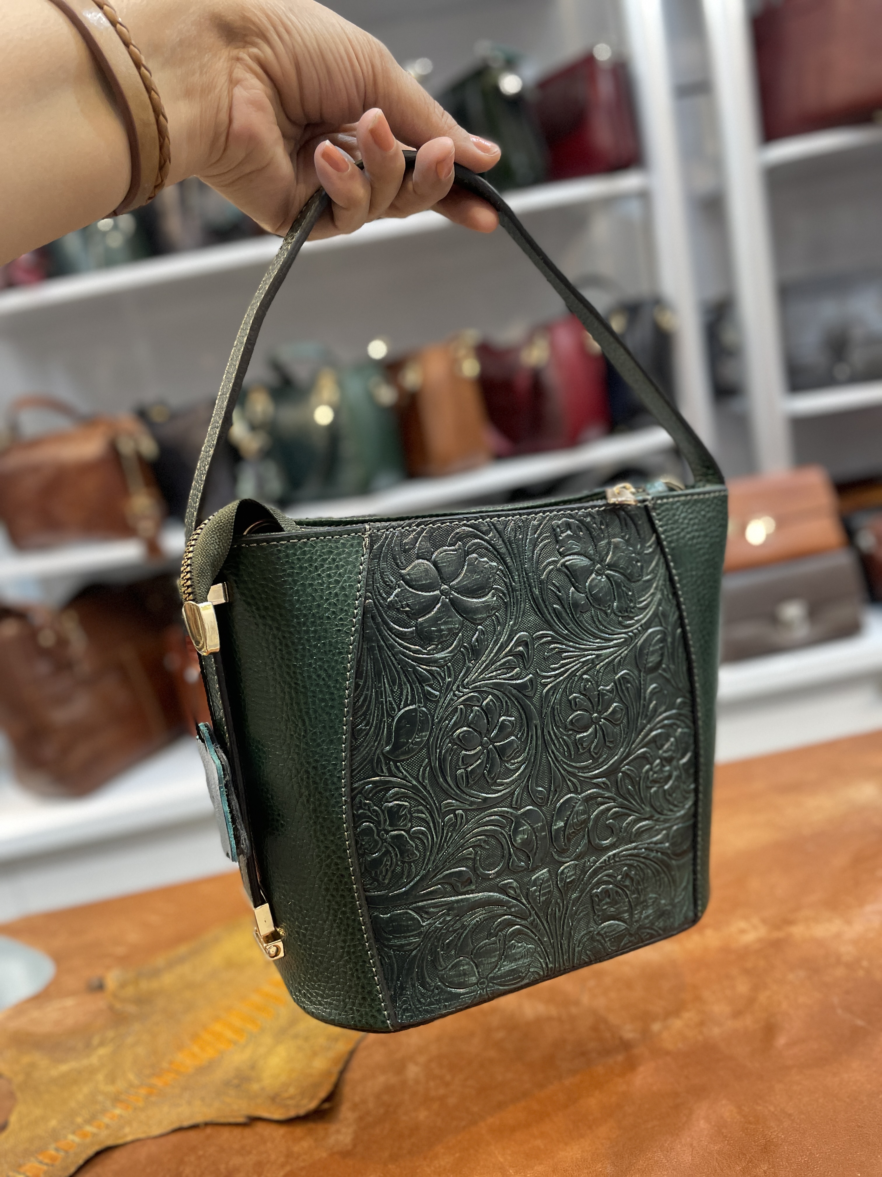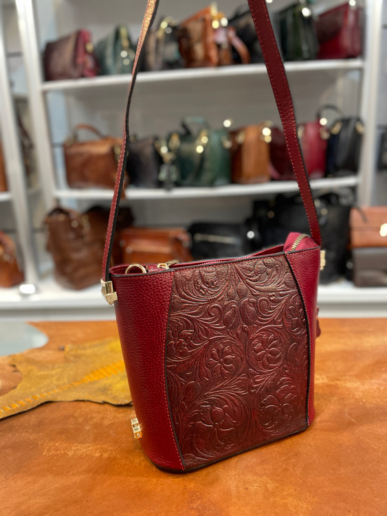 كيف دستي و دوشي زنانه ، حكاكي شده، تمام چرم طبيعي ، قابليت كوتاه و بلند شدن دسته كيف و داراي بند بلند دوشيو آيينه و سركليدي ست