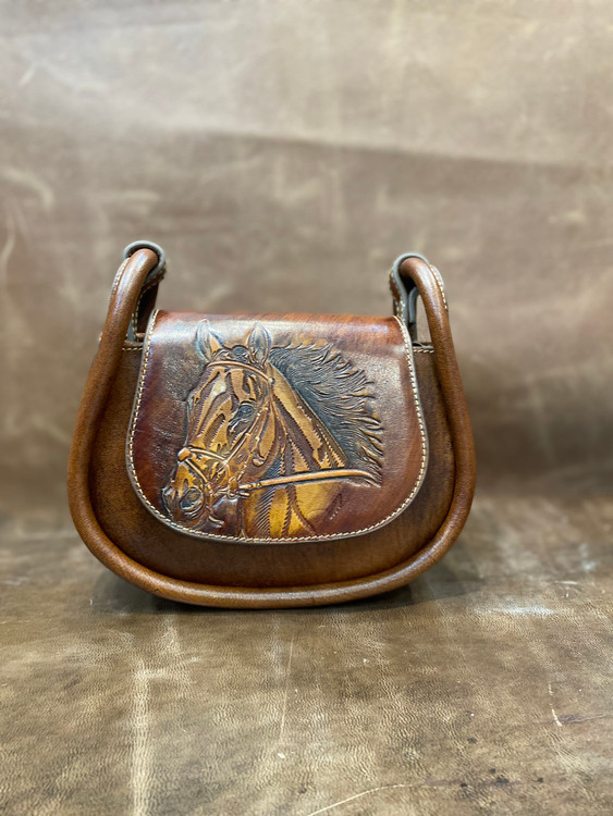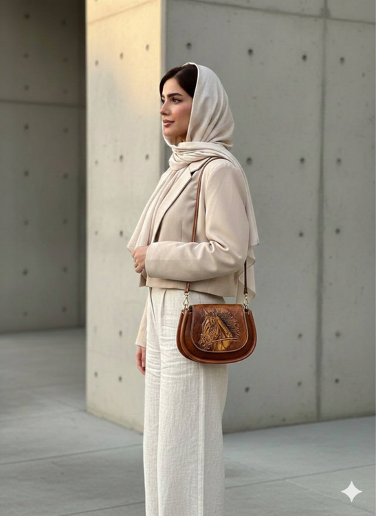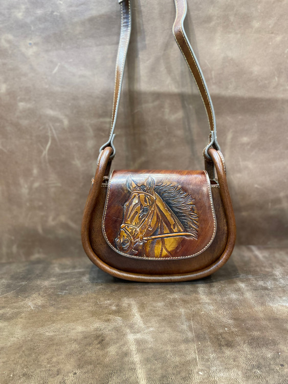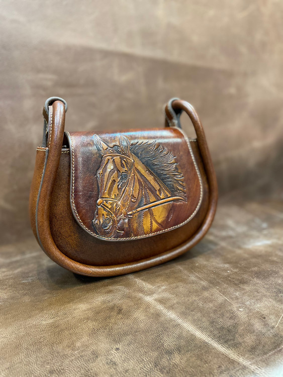 کیف دوشی چرم ، مدل مینا، با حکاکی طرح اسب-چرم گابای