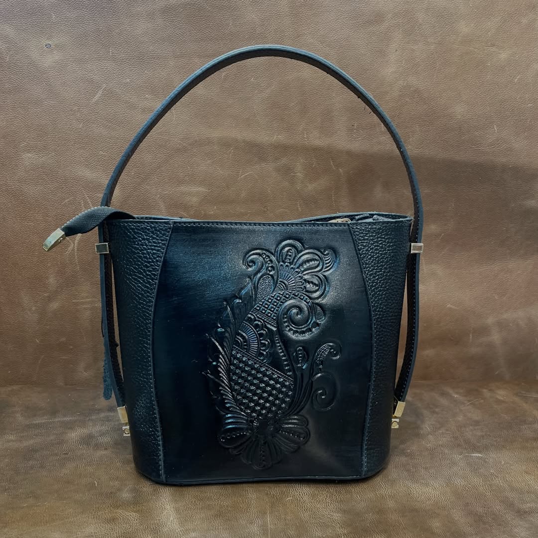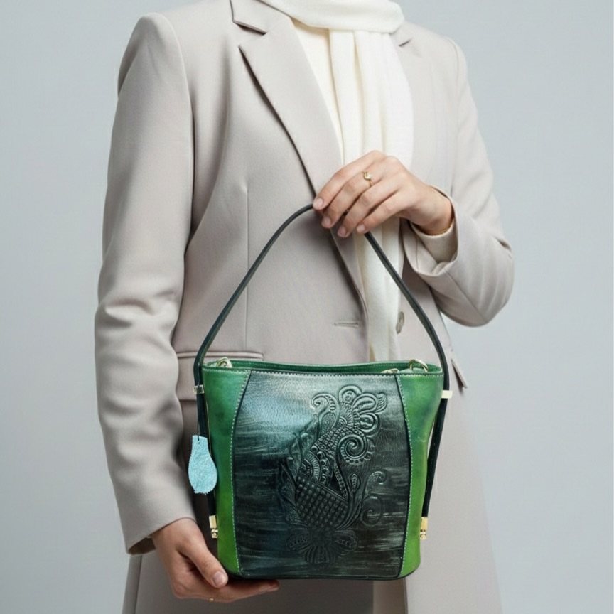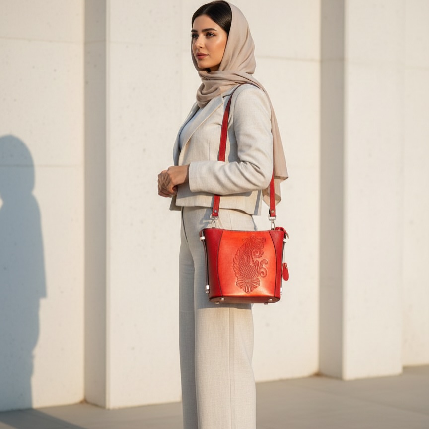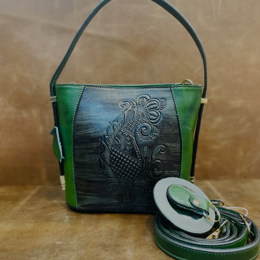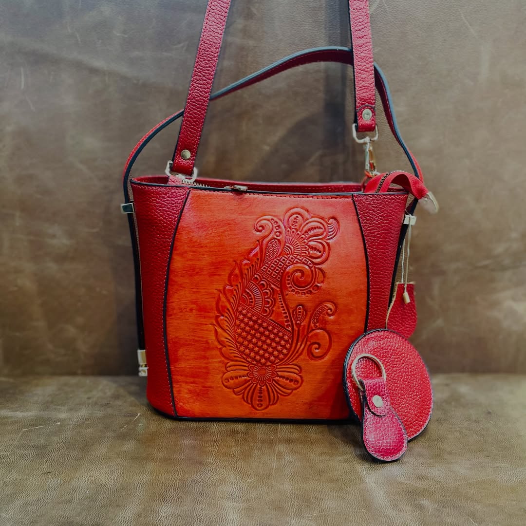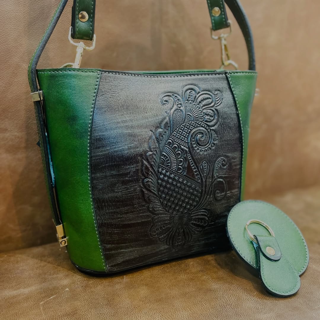كيف زنانه چرم حكاكي شده با طرح ترمه با قابليت كوتاه و بلند شدن دسته كيف داراي بند بلند دوشي و سركليدي هديه.
